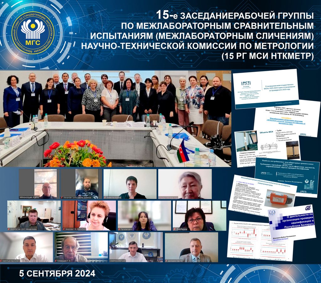 5 сентября 2024 года в г. Екатеринбурге, Российская Федерация, в гибридном формате состоялось 15-е заседание Рабочей группы по межлабораторным сравнительным испытаниям (межлабораторным сличениям) Научно-технической комиссии по метрологии (РГ МСИ НТКМетр)