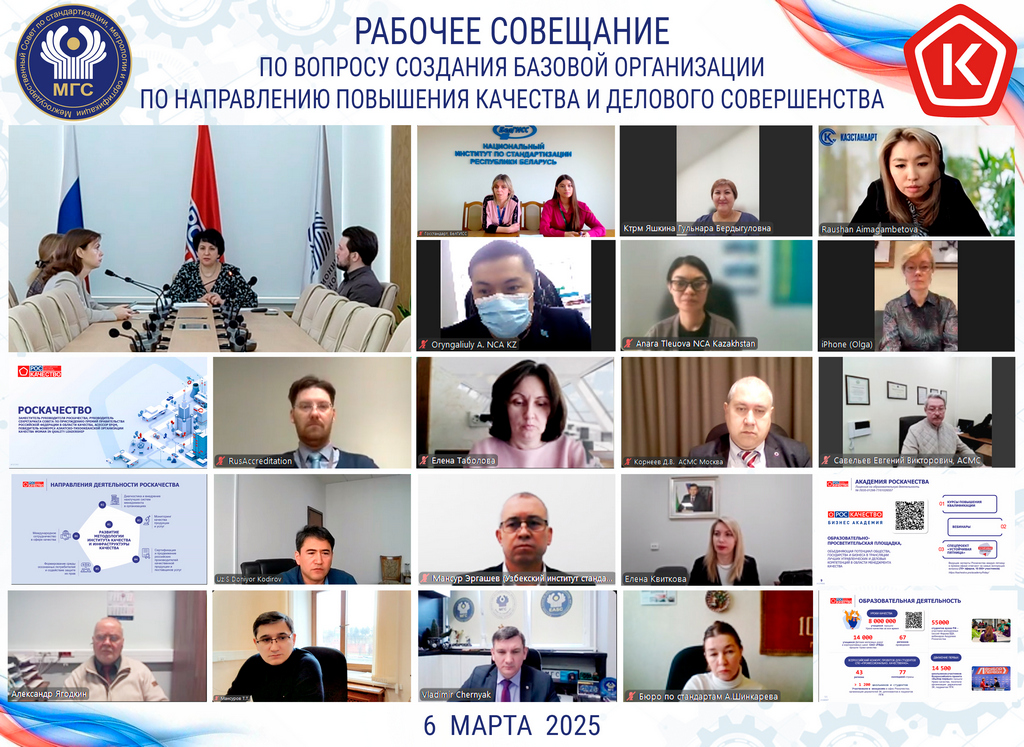 В рамках выполнения решения, принятого членами МГС на66-ом заседании МГС, 06 2025 в формате ВКС состоялось рабочее совещание с целью проработки вопроса о целесообразности создания на базе АНО «Роскачество» Базовой организации государств – участников Содружества Независимых Государств по направлению повышения качества и делового совершенства, а также развития профессиональных компетенций специалистов в области качества.