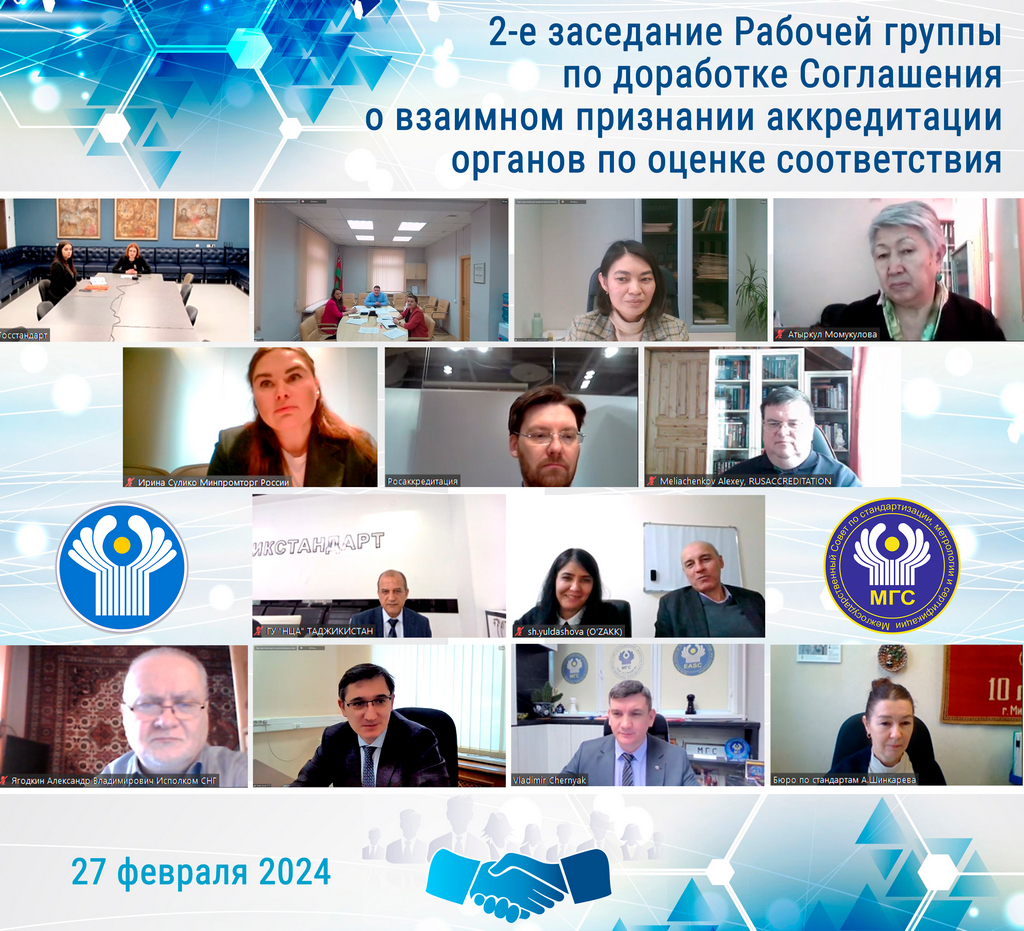 27 февраля 2024 года состоялось 2-е заседание Рабочей группы по доработке Соглашения о взаимном признании аккредитации органов по оценке соответствия (РГ ВПА) Межгосударственного совета по стандартизации, метрологии и сертификации.