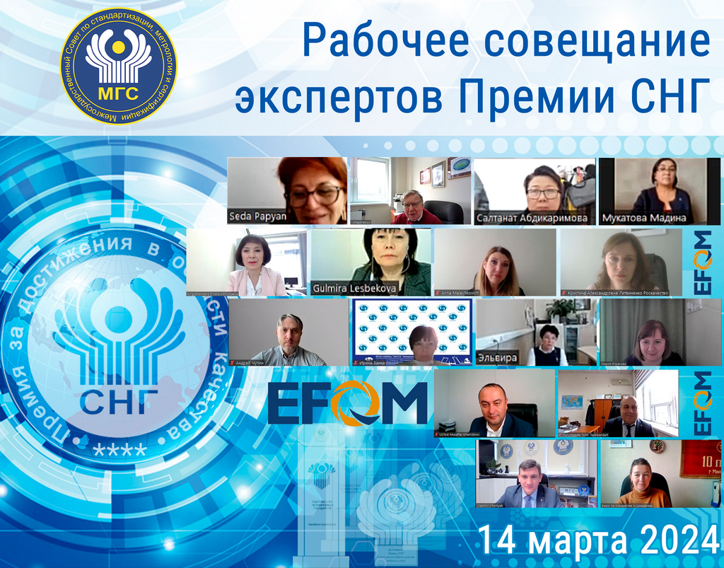 В соответствии с рекомендацией, выработанной участниками Рабочего совещания, состоявшегося 19.01.2024, для определения понятийного аппарата, используемого в разрабатываемых документах, необходимых для перехода конкурса на соискание Премии СНГ за достижения в области качества продукции и услуг на новую модель 14 марта 2024 года в формате видеоконференции состоялось рабочее совещание.