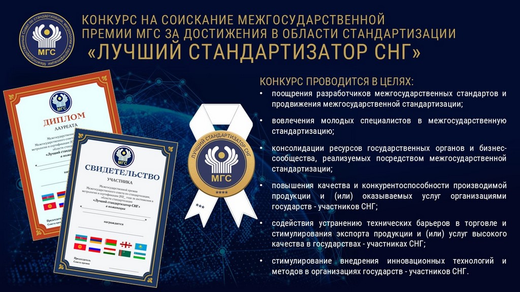 21 октября 2025 г. в целях реализации решения по п. 13.6 протокола МГС № 67-2025 в формате видеоконференцсвязи состоялась рабочая встреча Кыргызстандарта и Бюро по стандартам по вопросу организации и проведения конкурса на соискание Премии МГС за достижения в области стандартизации «Лучший стандартизатор СНГ» (далее - Премия МГС). В рабочей встрече приняли участие руководители – Председатель МГС - директор Центра по стандартизации и метрологии при Министерстве экономики и коммерции Кыргызской Республики (Кыргызстандарт) Айбек Нарынбекович Мусаев и директор Бюро по стандартам – Ответственный секретарь МГС Владимир Николаевич Черняк, а также сотрудники организаций.