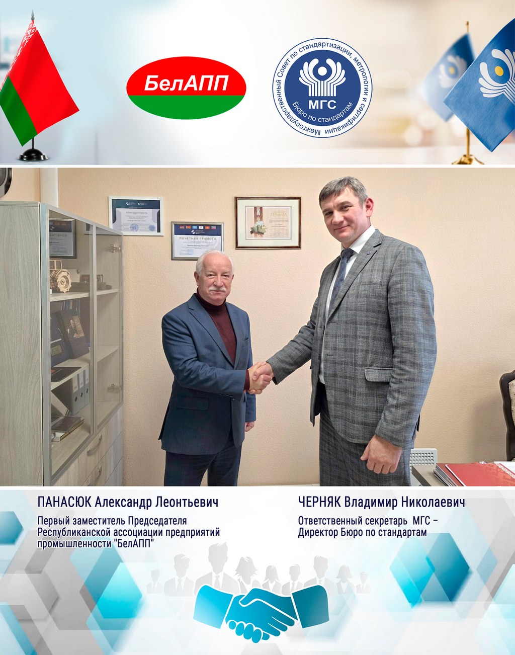 В ходе встречи обсуждены вопросы взаимовыгодного сотрудничества Республиканской ассоциации предприятий промышленности «БелАПП» и МГС по направлениям деятельности представляющим взаимный интерес, повышению роли промышленного комплекса, его значимости в работе Межгосударственных технических комитетов по стандартизации (МТК), разработки документов по межгосударственной стандартизации (ГОСТ, ПМГ, РМГ).