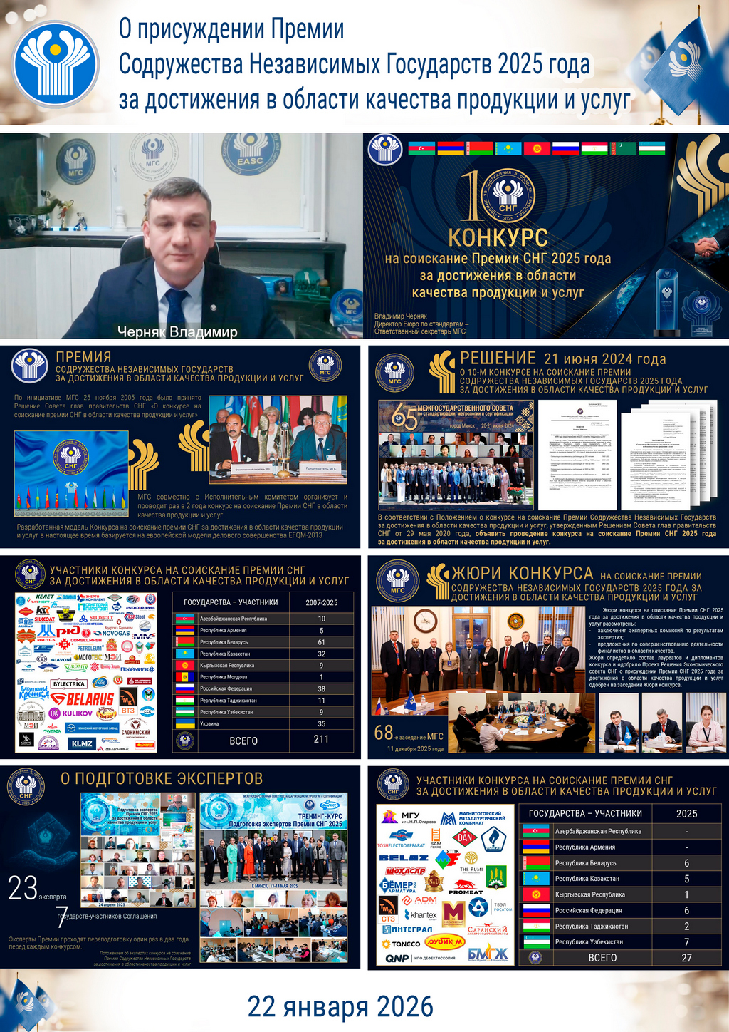 По вопросу повестки «О присуждении Премии Содружества Независимых Государств 2025 года за достижения в области качества продукции и услуг» с презентацией выступил директор Бюро по стандартам – Ответственный секретарь Межгосударственного совета по стандартизации, метрологии и сертификации Черняк Владимир Николаевич и ознакомил участников заседания с ходом проведения конкурса. Была отмечена важность и ответственность работы, проводимой экспертами Премии СНГ при оценке конкурсантов. Пользуясь случаем Черняк В.Н. поблагодарил их за профессионализм и компетентность. Проект Решения Экономического совета СНГ о присуждении Премии Содружества Независимых Государств 2025 года за достижения в области качества продукции и услуг, ранее одобренный Жюри конкурса, заседание которого состоялось 11 декабря 2025 года в рамках 68-го заседания МГС, принят в рамках настоящего заседания.