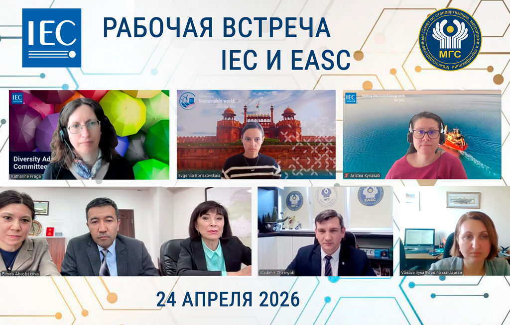 24.04.2026 состоялась встреча между IEC (Международная электротехническая комиссия – МЭК) и EASC (Межгосударственный совет по стандартизации, метрологии и сертификации государств-участников СНГ – МГС) с участием Центра по стандартизации и метрологии при Министерстве экономики и коммерции Кыргызской Республики (Кыргызстандарт) по обсуждению вопроса регионального сотрудничества между МЭК и МГС.