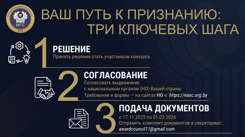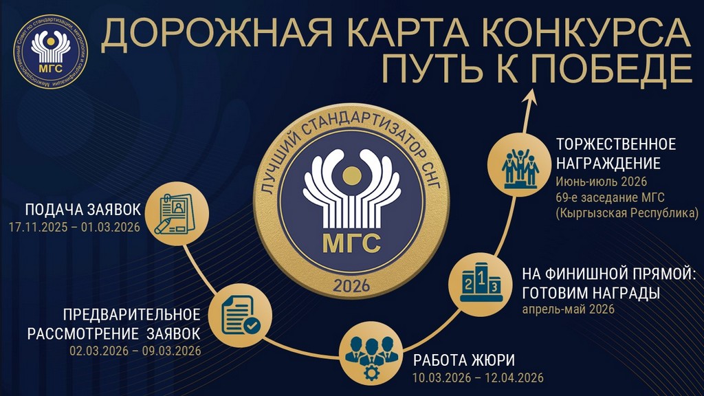 Решением 68-го заседания Межгосударственного совета по стандартизации, метрологии и сертификации (далее – МГС), в соответствии с Положением о Международном конкурсе «Лучший молодой метролог СНГ», утвержденным Решением Экономического совета СНГ от 18 июля 2025 года, объявлен первый Международный конкурс «Лучший молодой метролог СНГ» (далее – конкурс). По предложению Федерального агентства по техническому регулированию и метрологии Российской Федерации конкурс состоится 16-17 июня 2026 года в г. Санкт-Петербурге, Российская Федерация, на площадке IV Международной научно-практической конференции молодых ученых и специалистов «ЗА НАМИ БУДУЩЕЕ».